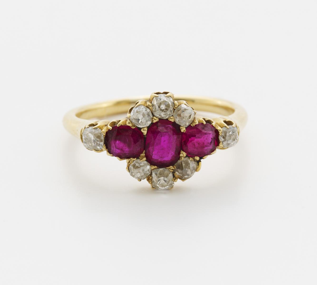 750/- Gelbgold, gestempelt, Gewicht: 3,2g. 3 oval facettierte Rubine D. 5 x 4mm, 4 x 3mm, 8 winzige Altschliff-Diamanten zus.ca. 0,42ct, EU-RM: 54. Ringtop: D. 17 x 10mm.