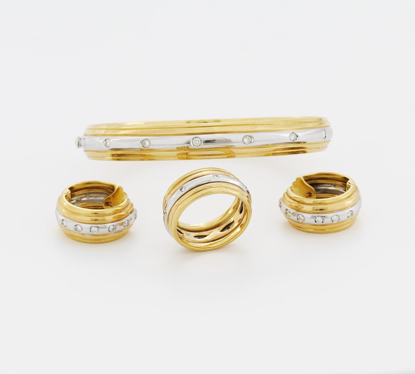 750/- Gelb-/Weißgold, Gewicht: Total: 85,2g. Ohrstiftcreolen: 12 Brill. zus.ca. 0,24ct; Ring: 9 Brillanten zus.ca. 0,09ct; Amreif: 7 Brillanten zus.ca. 0,14ct, EU-RM: 57. Ohrstiftgehänge: 18 x 10mm, Amreif: D. 62mm.