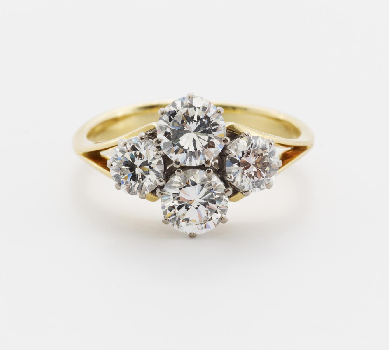 750/- Gelb-/Weißgold, gestempelt, Gewicht: 4,2g. 4 Brillanten zus. ca. 1,80ct FW(F-G) VS, EU-RM: 56,5. Ringtop: 19 x 11mm.