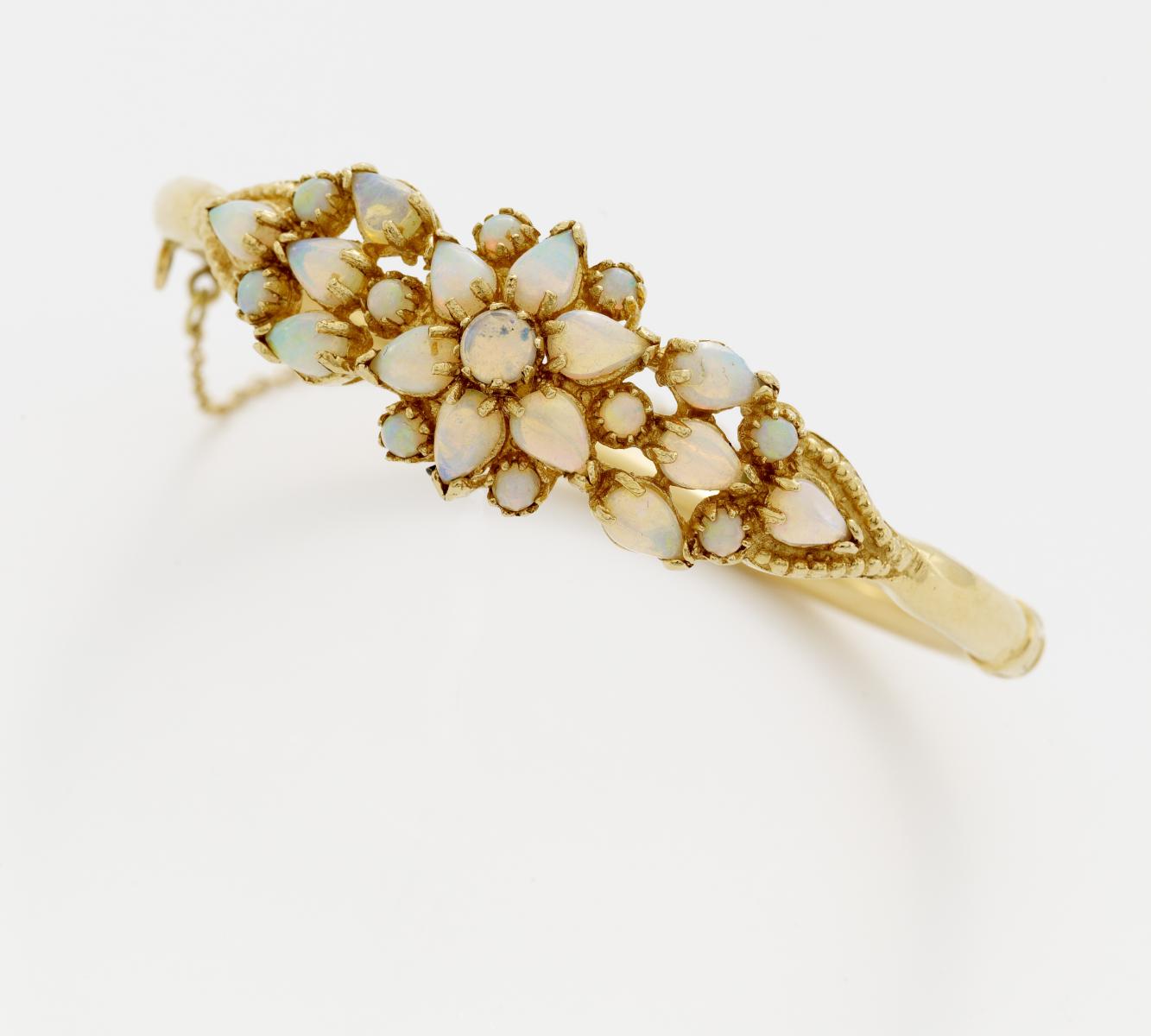 585/- Gelbgold, Importmarke (NL), Punze (DA), Gewicht: 20,7g. 14 tropfenförmige Chrystalopale zus.ca. 3,36ct und 10 runde Chrystalopale Cabochons zus.ca. 0,80ct, H x B= 5,1 x 5,5cm.