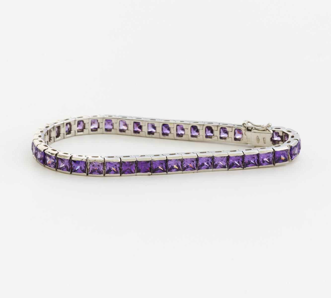 750/- Weißgold, Gewicht: 28,4g. 40 facettierte Amethyst-Karrees D. 4mm, feine Farbqualität (bläulich-violett), L x B=19 x 0,5cm.