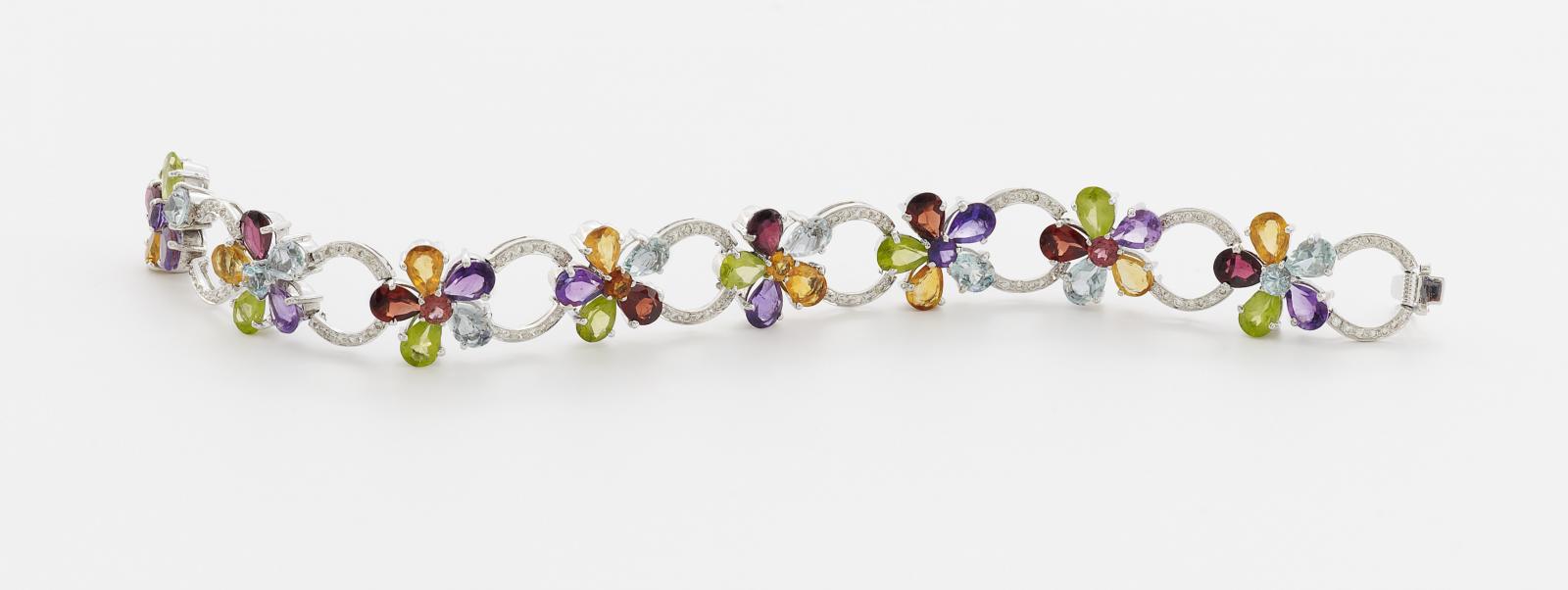 750/- Weißgold, gestempelt, Gewicht: 32,0g. 8 fac. Peridot-/ Amethyst-/ Granat-/ Citrin-/ Aquamarintropfen, D. ca. 7 x 4mm; 2 rund fac. Turmaline/ Aquamarine/ Amethyste/ Citrine, D. ca. 4mm, ca. 112 Brillanten zus.ca. 1,14ct W(H) VS, L x B=19,5 x 0,9cm. Neuwertig.