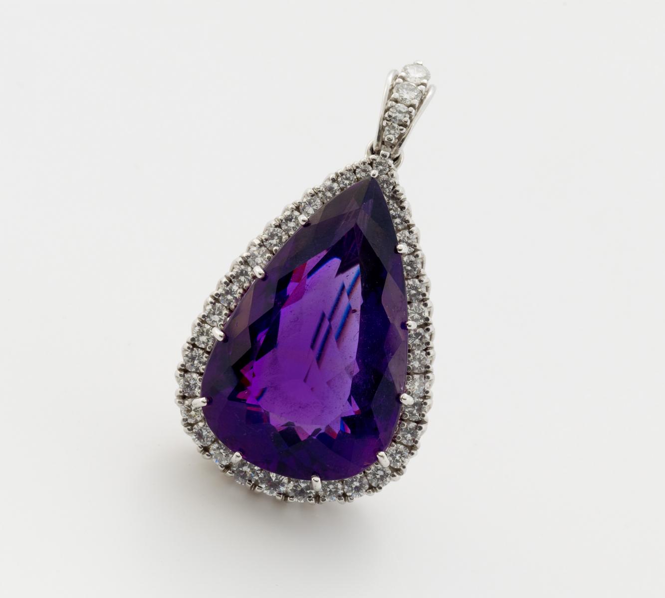 585/- Weißgold, Gewicht: 28,1g. 1 tropfenförmig fac. Amethyst ca. 21,31ct, 40 Brillanten zus.ca. 2,80ct TW-W (F-H) VS2-SI2, H x B=39 x 29mm (ohne Anhängeröse).