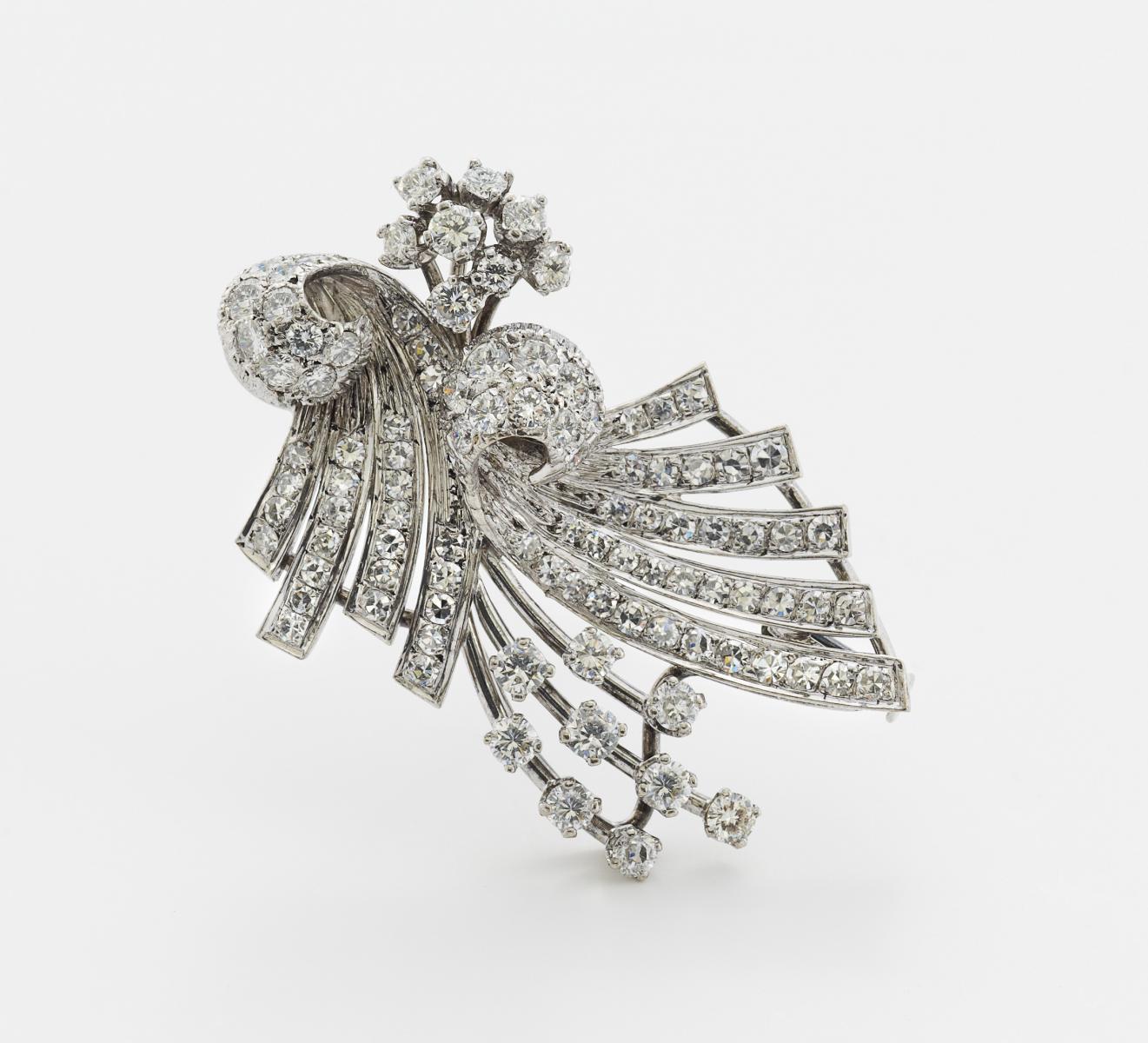 750/- Weißgold, Gewicht: 12,1g. 38 Brillanten und ca. 63 8/8-Dia. zus.ca. 2,73ct FW(G) VSI, H x B=43 x 25mm.