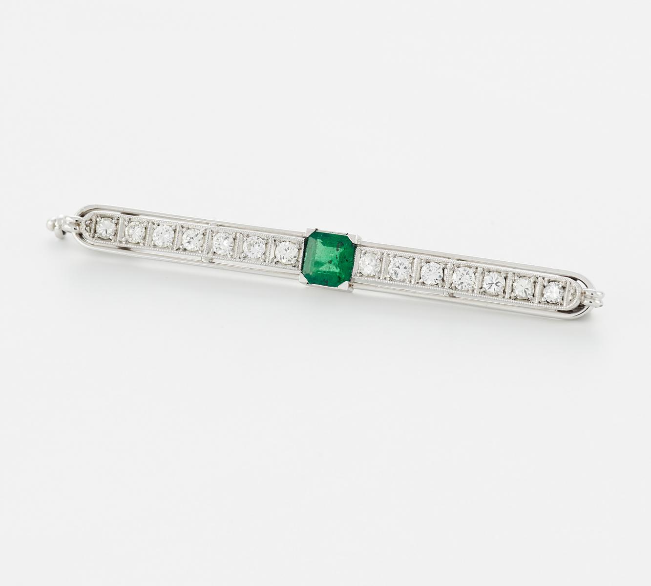 585/- Weißgold, Gewicht: 6,9g. 1 Smaragd-Achteck/ Treppenschliff ca. 0,90ct, sehr gute Farbintensität, 14 Brillanten zus.ca. 0,85ct W-Tchry (H-I) VVS-VS, Schliff: gut, H x B=65 x 6,8mm.