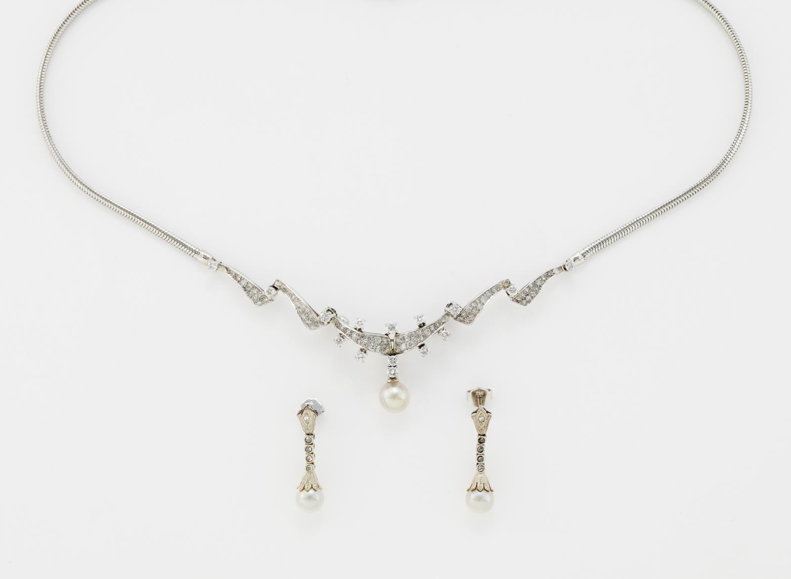 Set: Ohrstiftgehänge und Collier mit Perl-Diamantbesatz.