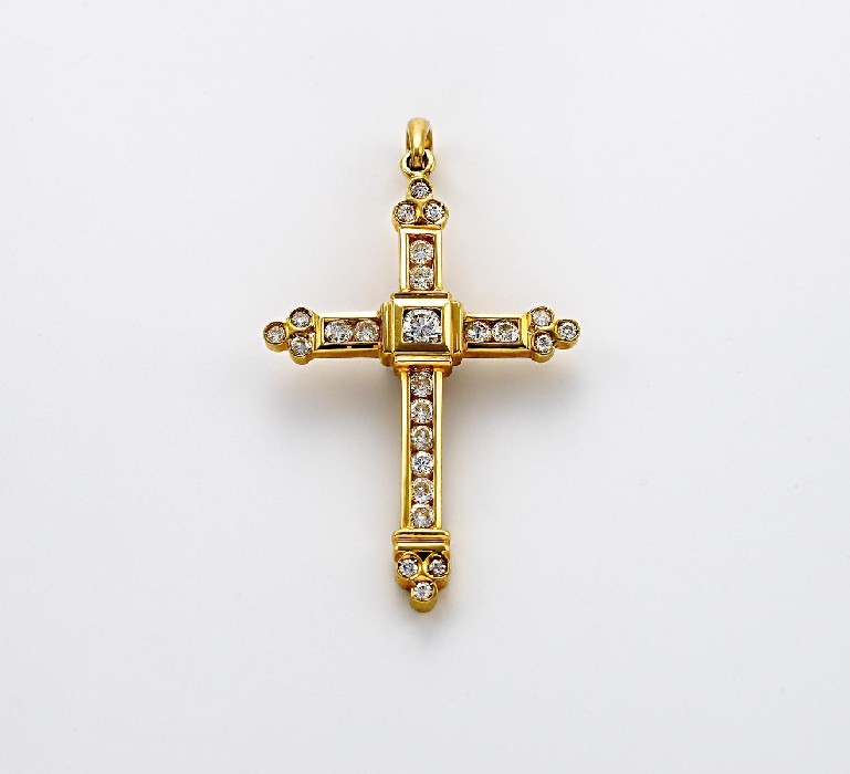 750/- Gelbgold, Gewicht: 3,7g. 25 Brillanten zus.ca. 0,69ct, TW (F-G), VVS-IF, 4,0 x 2,3cm. Neuwertig.