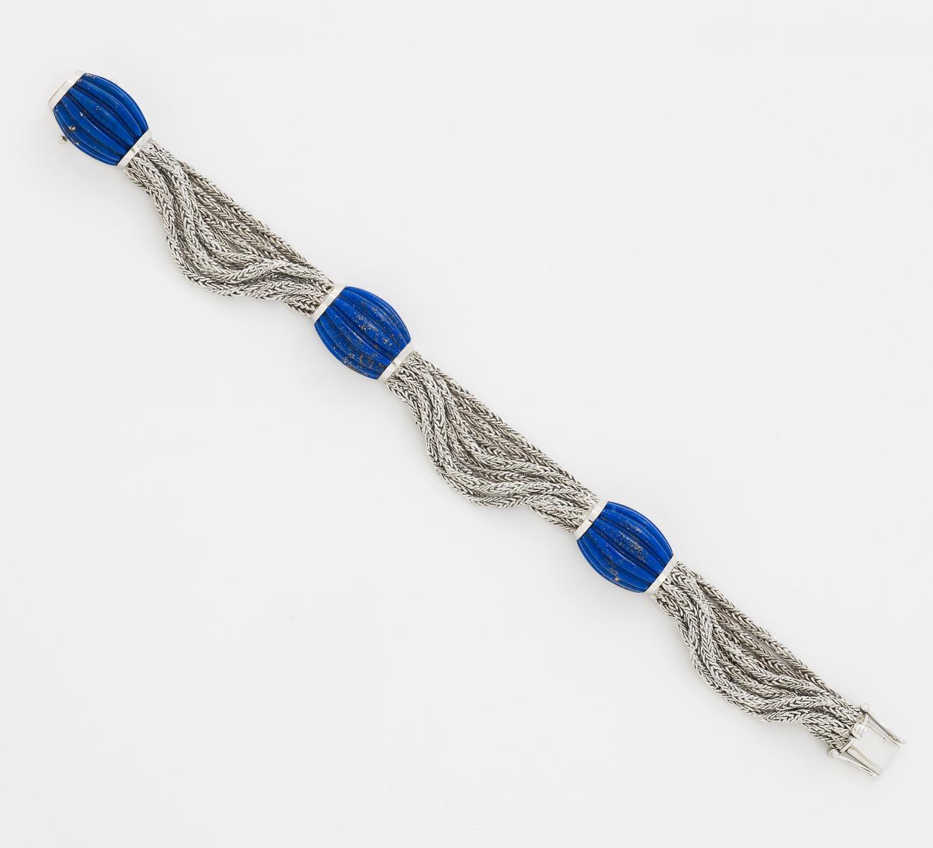 750/- Weißgold. 64,1g. 3 fancy cut Lapislazuli-Rondelle (hälftig) D. 16 x 13mm, L x B=20 x 1,3cm.~ Neunreihig. Deutschland, um 1960/65.