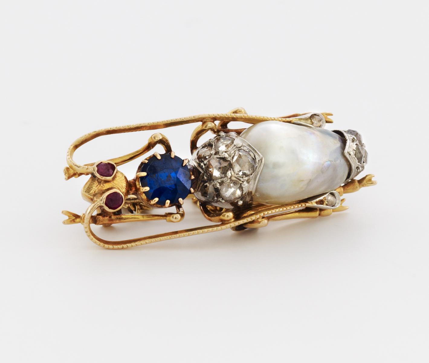 Käferbrosche mit Rubin-Saphir-Perlbesatz.
