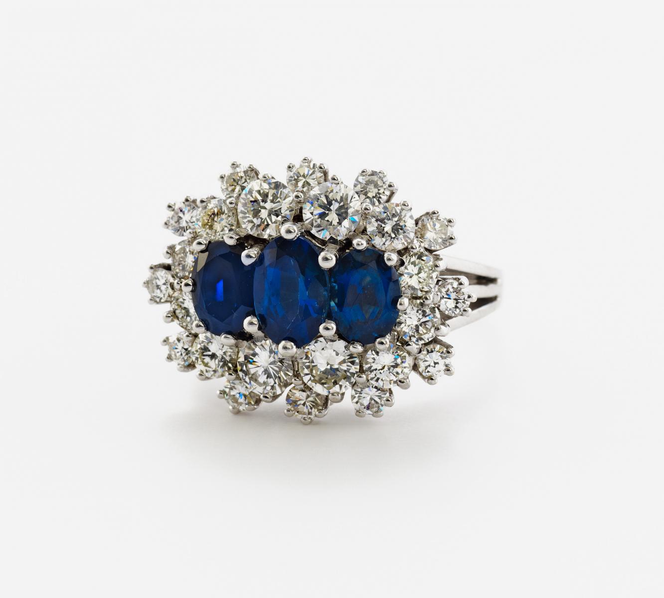 750/- Weißgold, Gewicht: 8,3g. 3 oval facettierte Saphire zus.ca. 2,11ct, 24 Brillanten zus.ca. 1,596ct W(H)VS-SI1, EU-RM: 54,5.