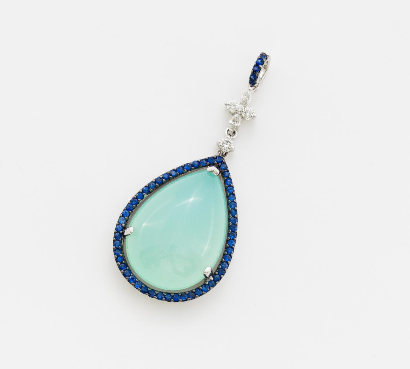 750/- Weißgold, gestempelt, Gewicht: 8,1g. Ca. 56 rund facettierte Saphire zus.ca. 0,23ct, 1 hellblauer Chalcedon-Tropfen D. 21 x 15mm, 3 Diamanten und 2 Diamant-Navettes zus.ca. 0,52ct, Anhänger: D. 26 x 19mm, Öse inkl. Diamantbesatz: L. 18mm.