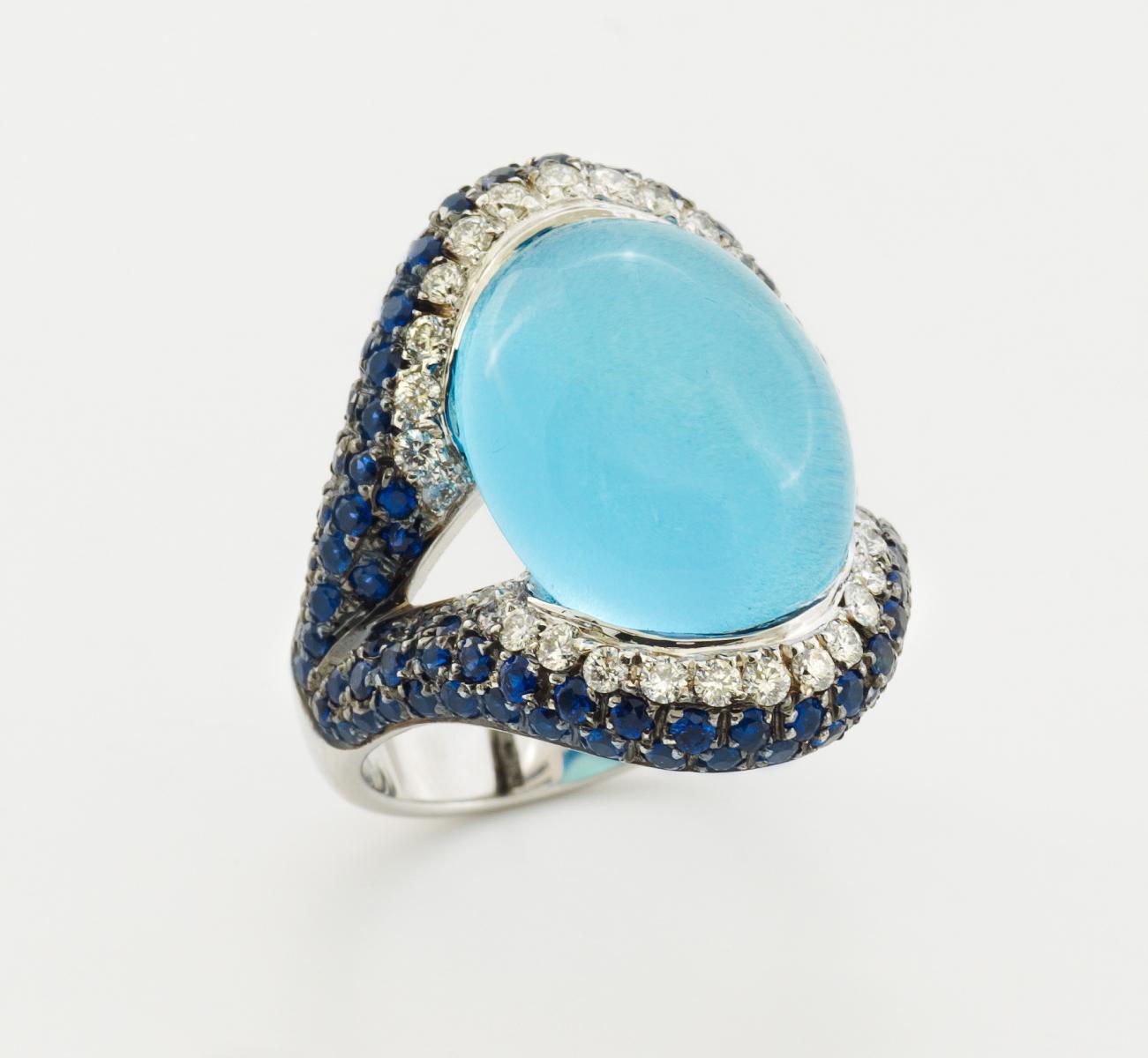 750/- Weißgold, gestempelt, Gewicht: 14,2g. Ca. 100 rund facettierte Saphire zus.ca. 1,70ct, 1 ovaler Blautopas-Cabochon D. 16 x 13mm, Ca. 30 Diamanten zus.ca. 0,50ct W(H) VVS-SI, EU-RM: 53,5. Neuwertig.