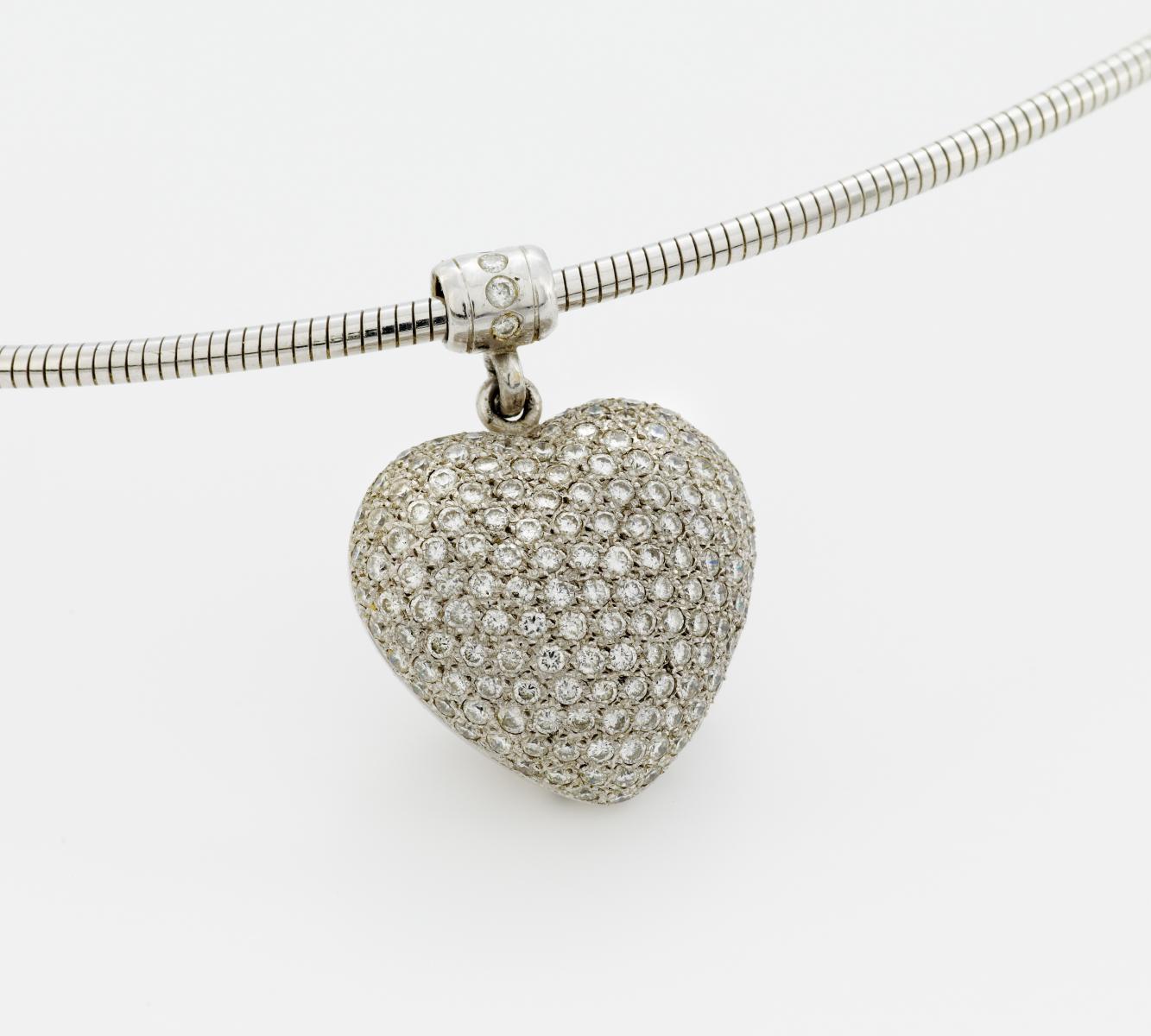 750/- Weißgold, Gewicht: 27,3g. Zahlreiche Brillanten zus.ca. 3,68ct W(H) VS, Halsreif: L. 46cm, Anhänger: H x B=33 x 25mm. Halsreif an einer Stelle defekt, geknickt.