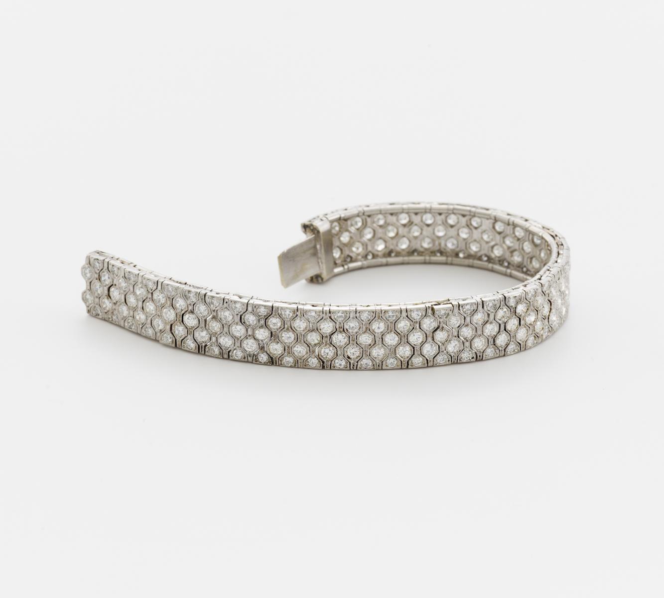 585/- Weißgold, Gewicht: 30,2g. 190 Brillanten zus.ca. 5,32ct W(H) SI, L x B=16,6 x 1,0cm. 2 Verlängerungselemente anbei, 76 Elemente, dehnbar auf 2 Stahlspiralen aufgezogen, ein