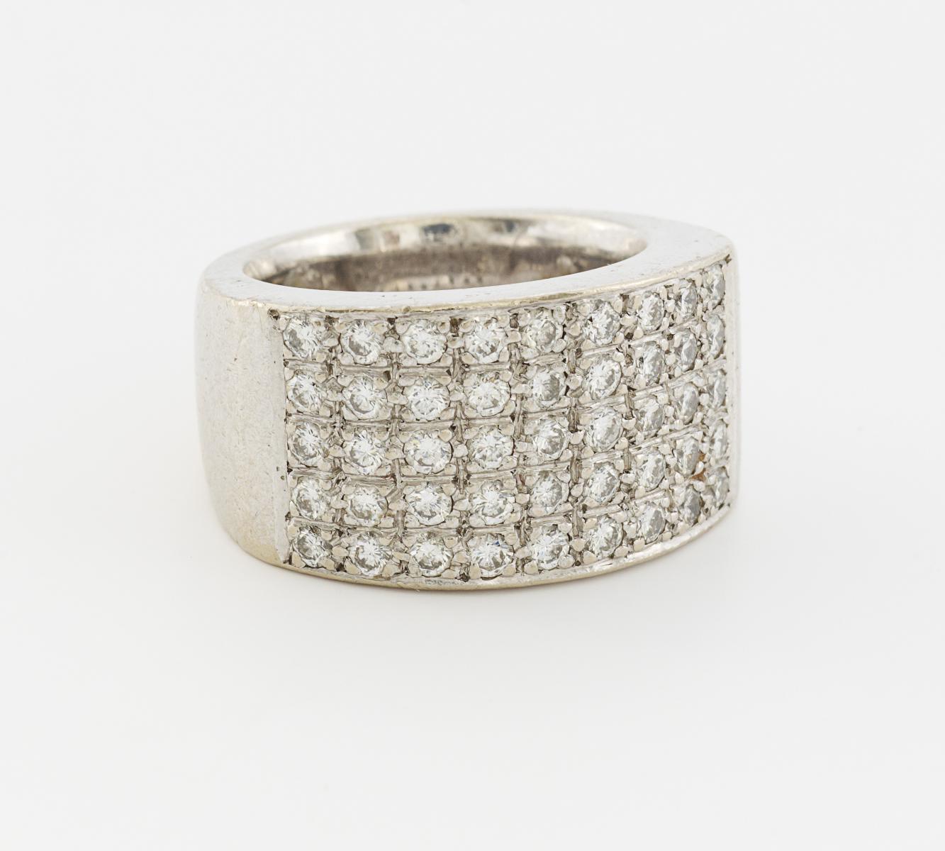 750/- Weißgold, Gewicht: 22,2g. 45 Brillanten zus.ca. 0,90ct, EU-RM: 44,5. Ringtop: H x B=12 x 20mm. Ringschiene wurde mit zwei Kügelchen verkleinert.