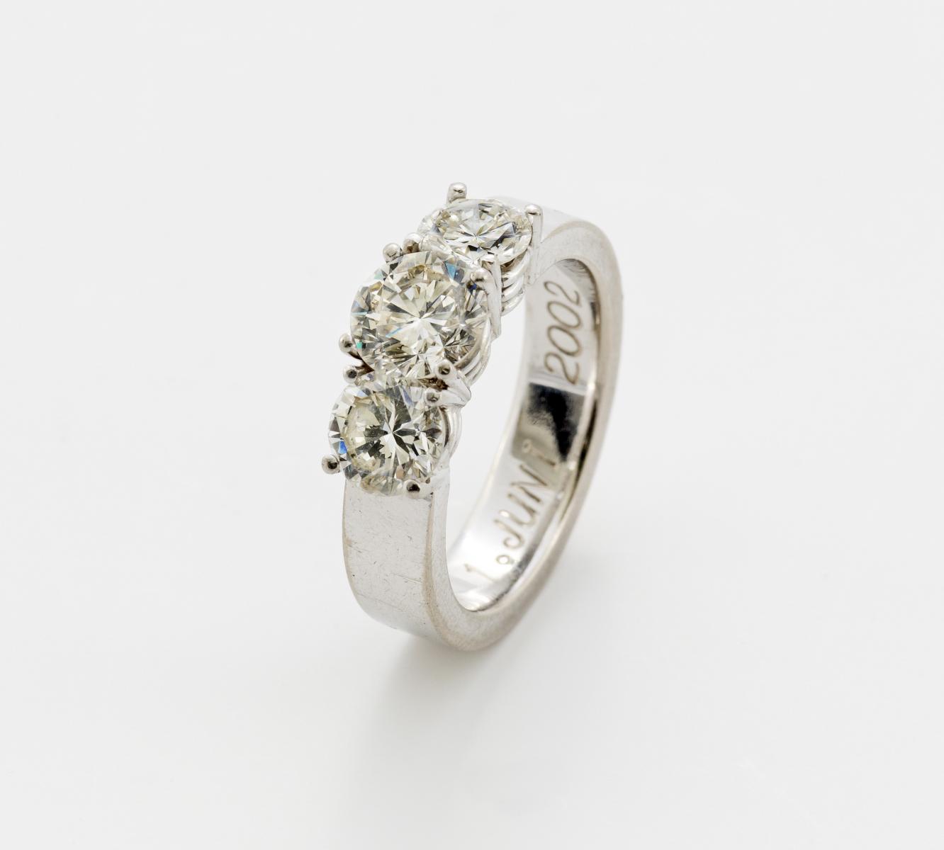 750/- Weißgold, gestempelt, Gewicht: 11,2g. 3 Brillanten zus.ca. 2,65ct W(H) VS-P1, EU-RM: 56,5. Innenseitige Gravur 1. Juni 2002.