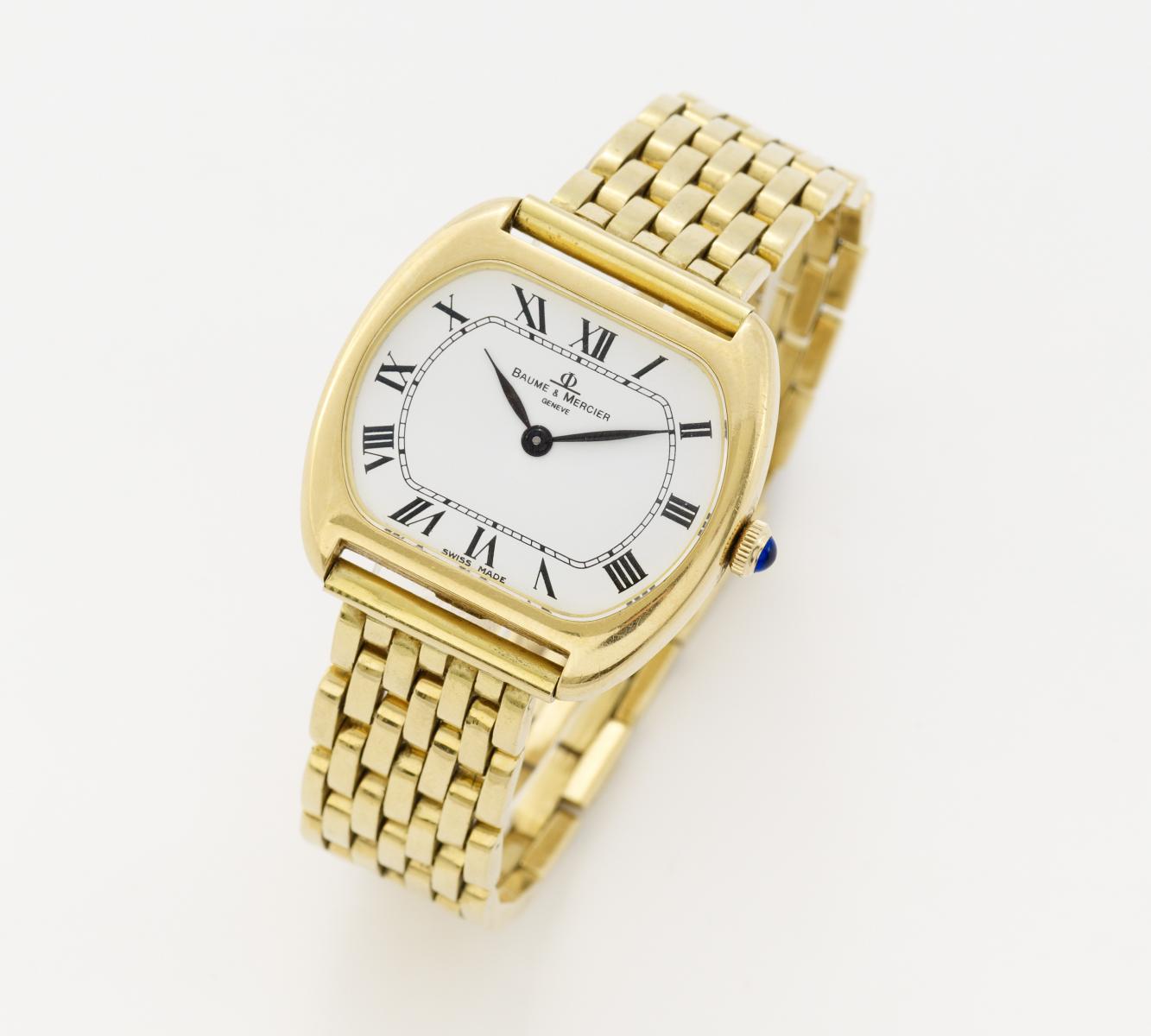 Herrenarmbanduhr. Gehäuse-Nr.: 37076. Referenz-Nr.: 525853. 750/- Gelbgold, gestempelt, Zifferbl. weiß, schwarze/römische Indizes, Saphircabochon, Handaufzug. Armband nachträglich. D. 33 x 33mm, L. 22cm. Gewicht: 106,1g.