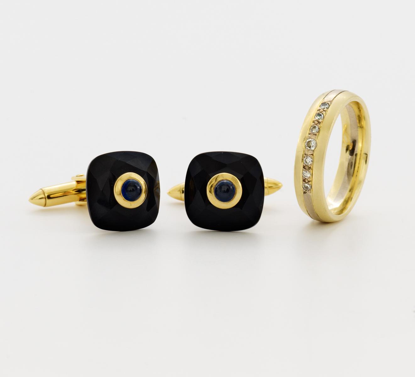Ring: 585/- Gelbgold, Manschettenknöpfe: 750/- Gelbgold, Gewicht: Total: 17,0g. 2 Onyxsteine im facettierten Cushion Cut ca. 1,4x1,4cm, 2 blaue Saphir Cabochons D. ca. 0,38ct, 7 Brillanten zus.ca. 0,108ct, EU-RM: 63. Top: 1,4 x 1,4cm, Stegtiefe: 1,4cm.