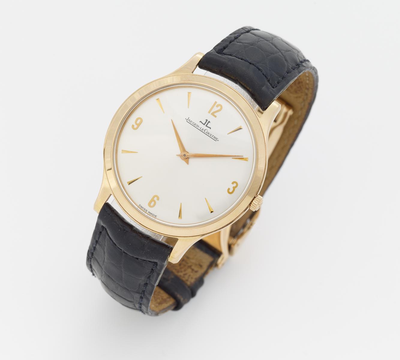 Master Ultra Thin. Herrenarmbanduhr. Gehäuse-Nr.: 0644. Referenz-Nr.: 145.240.792. Gehäuse: 750/- Rotgold, gestempelt, schwarzes Lederarmband, 750/- JLC-Faltschließe, Silberfarbenes Zifferblatt, rotgoldene Zeiger/Ziffern/Indizes, Handaufzug. In sehr gepflegtem Zustand. Original Box mit Serviceheft sowie Garantiekarte von Juni 2000
