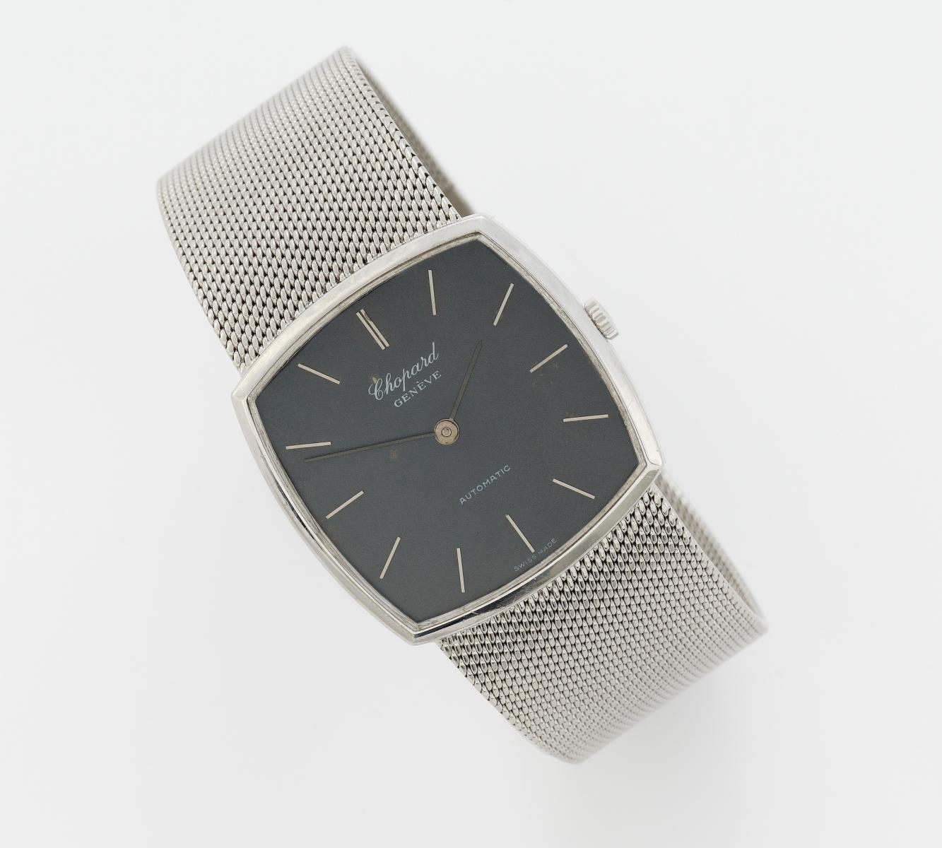 Herren-/Damenarmbanduhr. Gehäuse-Nr.: 2052. Referenz-Nr.: 60497. Gehäuse: 750/- Weißgold, gestempelt, Zifferbl. anthrazit, silberne Indizes/Zeiger, Automatik. Armband wurde verlängert. D. 31 x 31mm, L. 21,5cm. Gewicht: 89,2g.