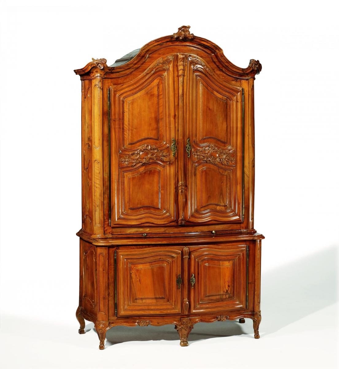 Nussbaum geschnitzt. Zweiteiliger leicht geschweifter Korpus auf Huffüßen. Unterteil und Aufsatz mit je zwei