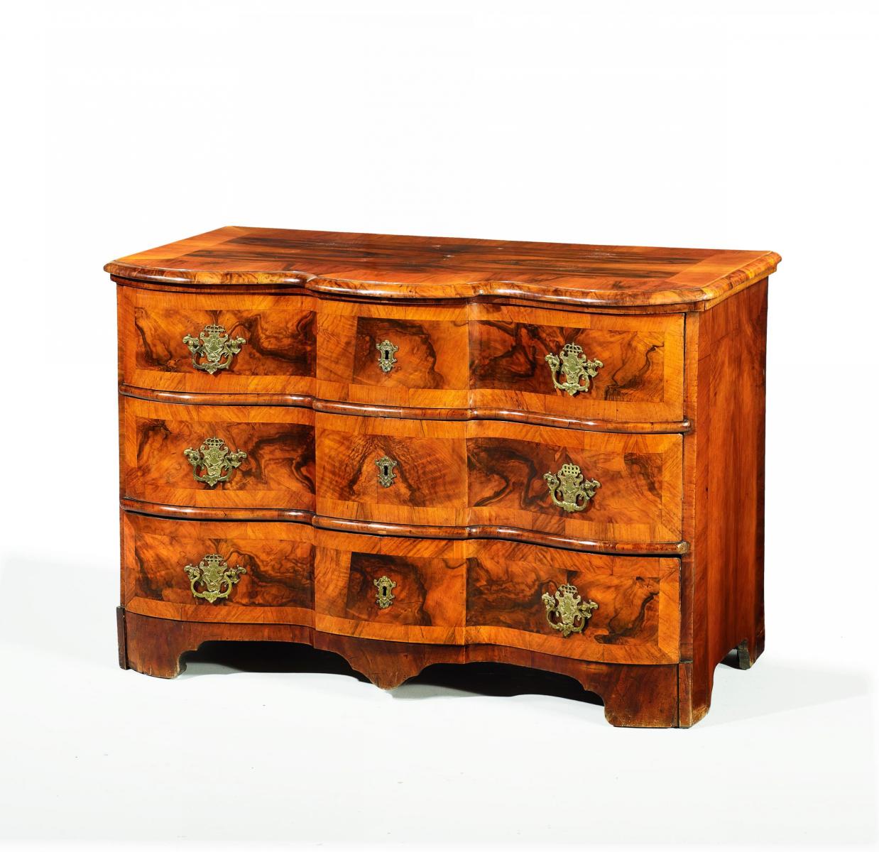 Nussbaum. Dreischübig geschweifter Korpus. 88x131x64cm. Zustand B.