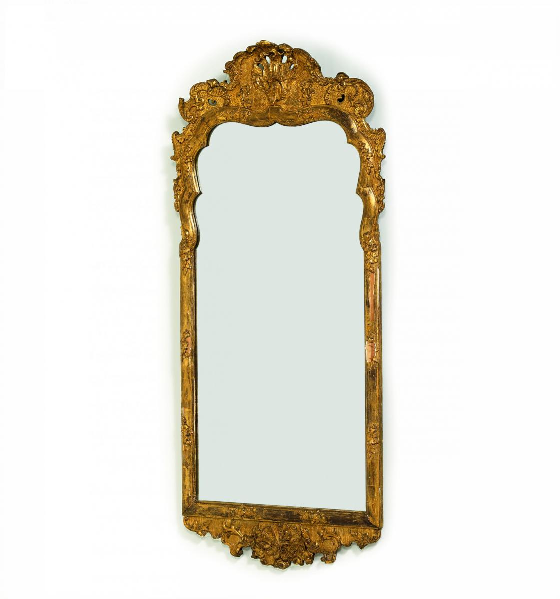 Holz geschnitzt und vergoldet. Hochrechteckige oben leicht geschweifte Rahmung mit Blüten und Lorbeerzier. 130 x 60cm. Zustand C.
