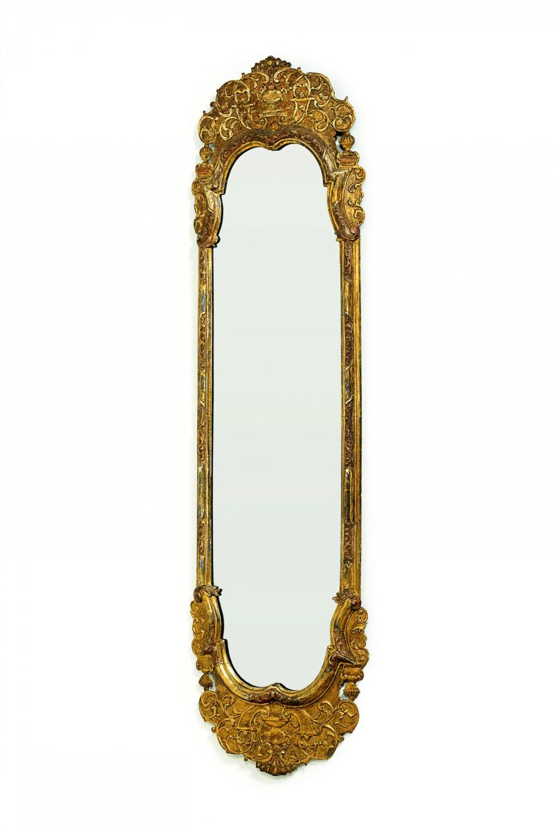Holz geschnitzt und vergoldet. Geschweifte Rahmung mit Akanthus und Urnendekor. 170 x 47cm. Zustand B/C.