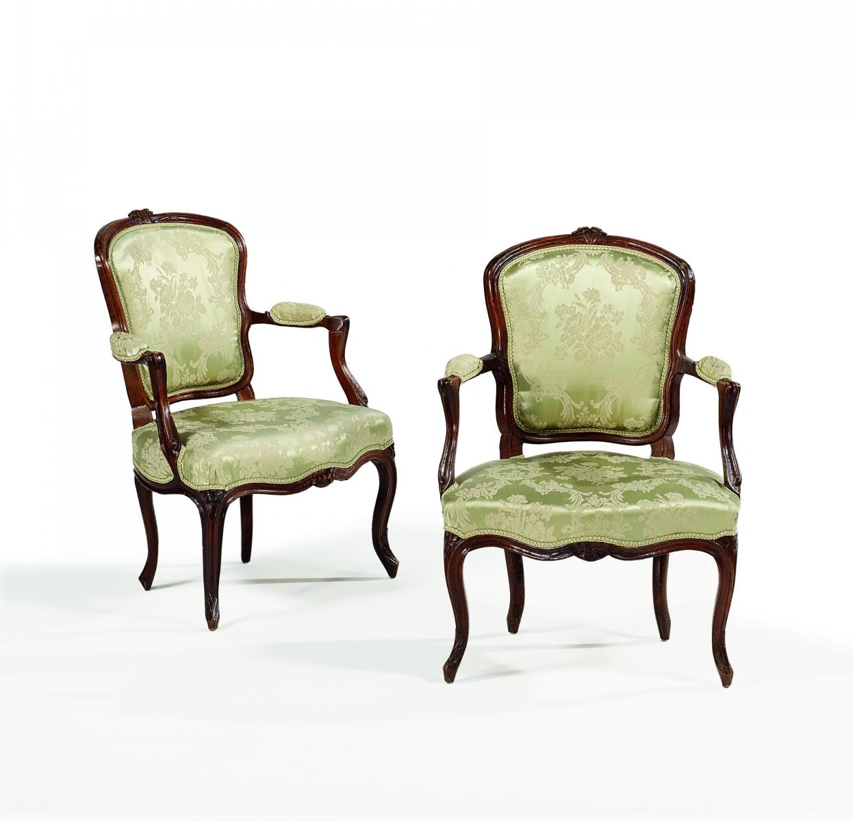 Nussbaum geschnitzt. Gepolstert. Geschweiftes Gestell mit Blütenzier. Höhe je 89cm. Zustand B.
