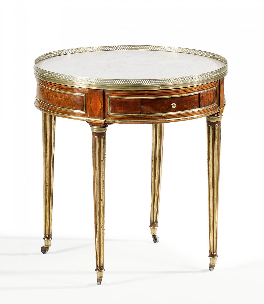 Nussbaum eingelegt. Applikationen. Marmorplatte. Runder Tisch auf Rollen. Bandeinlagen. Zwei Zargenschübe und zwei Ablagen. Höhe 71, Ø 65cm. Zustand B/C.