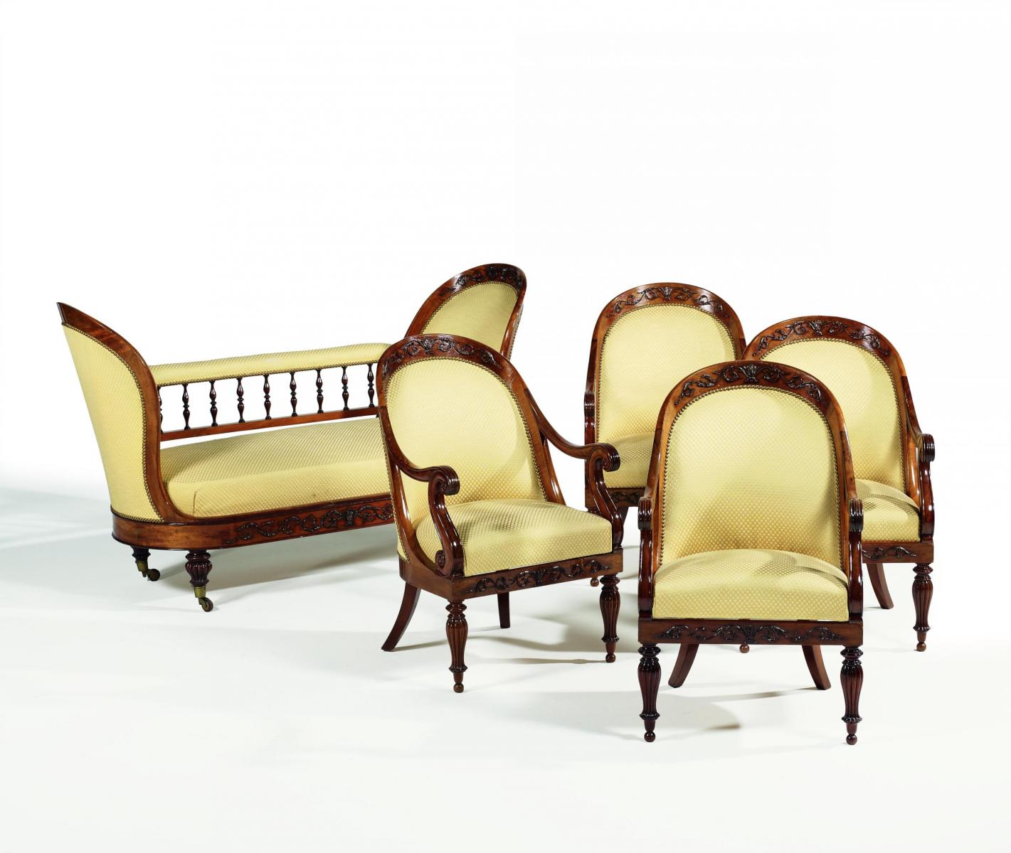 Mahagoni. Gepolstert. Bestehend aus vier Sesseln und einem Sofa auf Rollen. Höhe 88 bzw. 94x158x62cm. Zustand B.