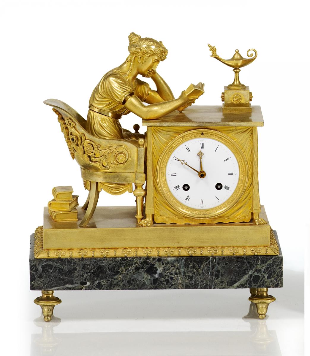 Bronze vergoldet. Marmorsockel. Emailzifferblatt. An einem Tisch sitzende junge Dame bei der Lektüre. Römische Ziffern und arabische