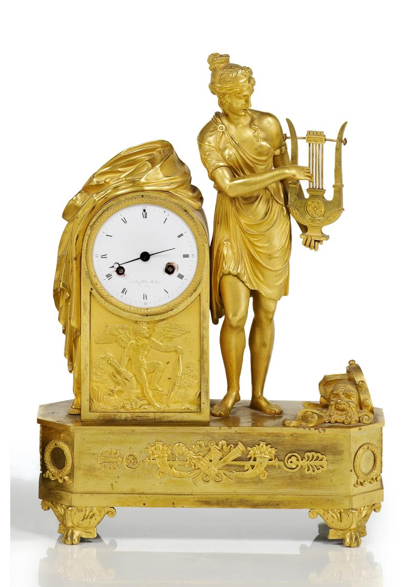 Bronze vergoldet. Emailzifferblatt. Sockel mit abgeschrägten Kanten und Applikationen auf Klauenfüßen. Darauf die Muse Erato