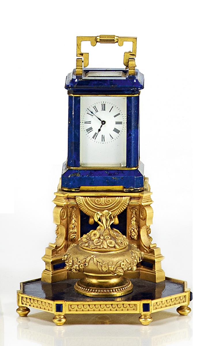 Vergoldete Bronze. Lapis. Blauer Lack. Emailzifferblatt. Tintenfass mit Girlandenzier. Reich dekoriertes Postament, darauf verglaste Uhr.