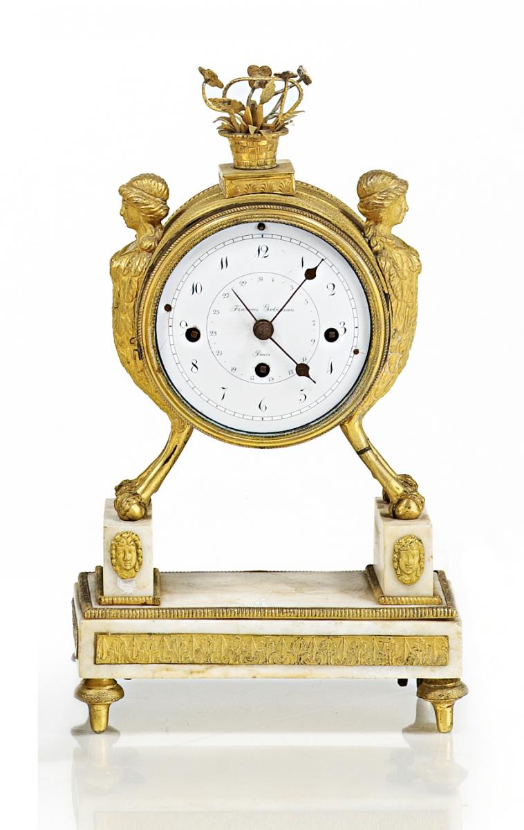 Weißer Marmor. Vergoldete Bronze. Emailzifferblatt. Rundes Gehäuse von weiblichen Chimären gehalten. Arabischen Ziffern. Zentrale