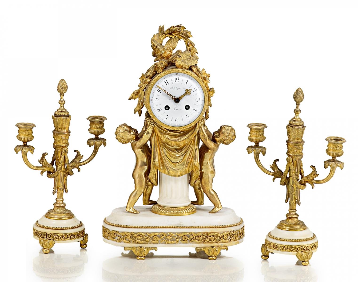 Garniture De Cheminée Aux Amours. Paris. Ende 19.Jh. Weißer Marmor und vergoldete Bronze. Rundes Gehäuse von zwei Amoretten getragen. Rundes verglastes Emailzifferblatt mit ...