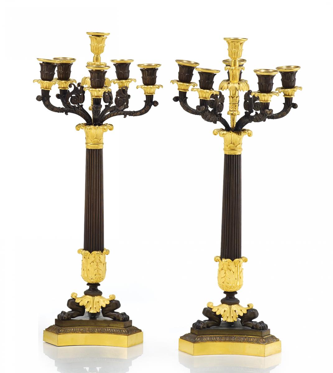 Bronze tlw. patiniert und vergoldet. Dreipassig eingezogene Sockelplatte. Löwentatzen. Kannelierter Schaft. Akanthusblattzier.
