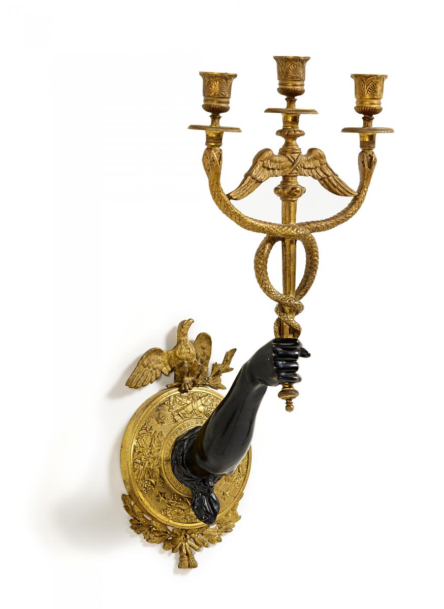 Bronze vergoldet und tlw. patiniert. Wandscheibe mit Adlerbekrönung, darauf Arm, dreiflammigen Leuchter mit Schlangen und Adler