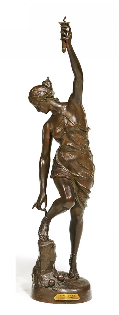 Bronze patiniert. Standfigur. Plakette bezeichnet Atalante Par G Saulo 2éme Médaille Expon Des Beaux Arts. Höhe 101cm. Zustand B. Reste alter Elektrifizierung.