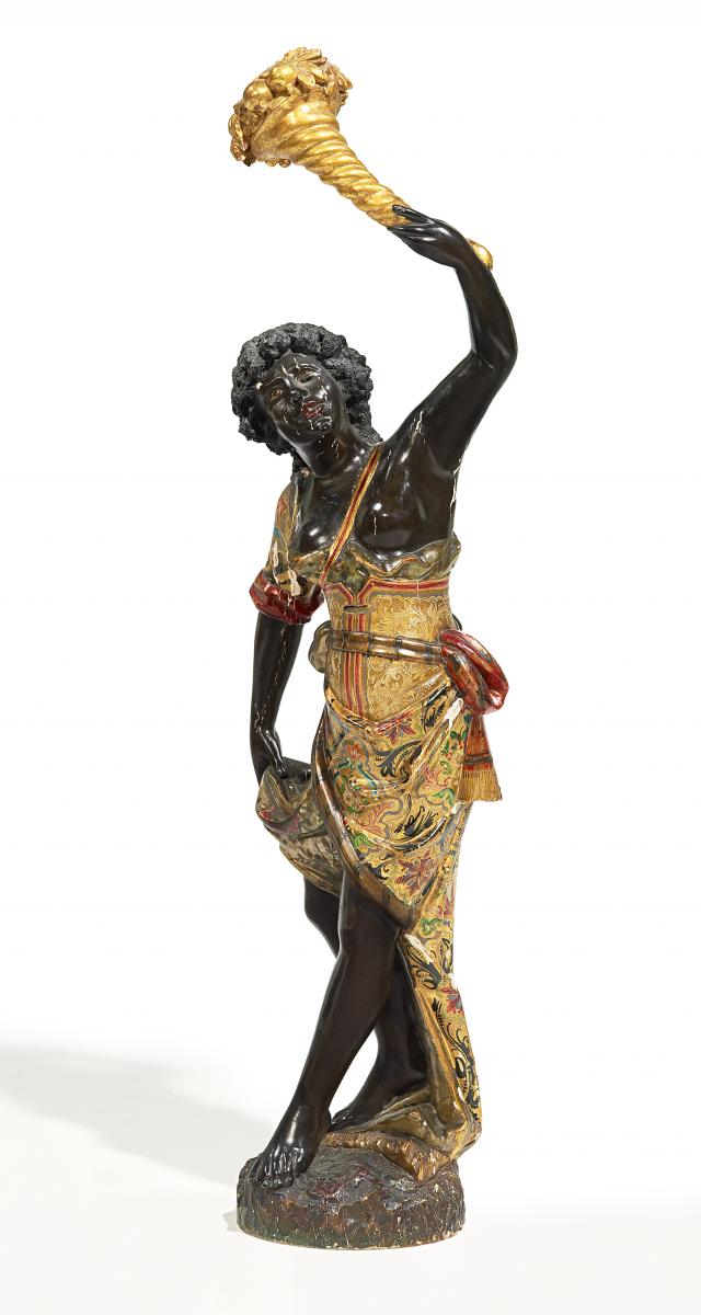 Holz geschnitzt und polychrom gefasst. Bewegte Standfigur. Mit erhobener Hand ein Füllhorn haltend. Höhe 114cm. Zustand B/C.