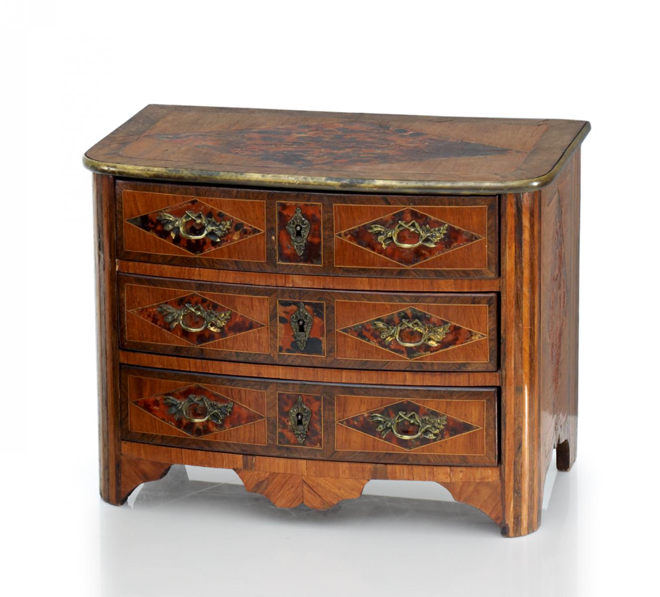 Rosenholz, Nussbaum, Schildpatt und Ahorn eingelegt. Leicht gerundete dreischübige Front. 34,5x45,5x29,5cm. Zustand C.