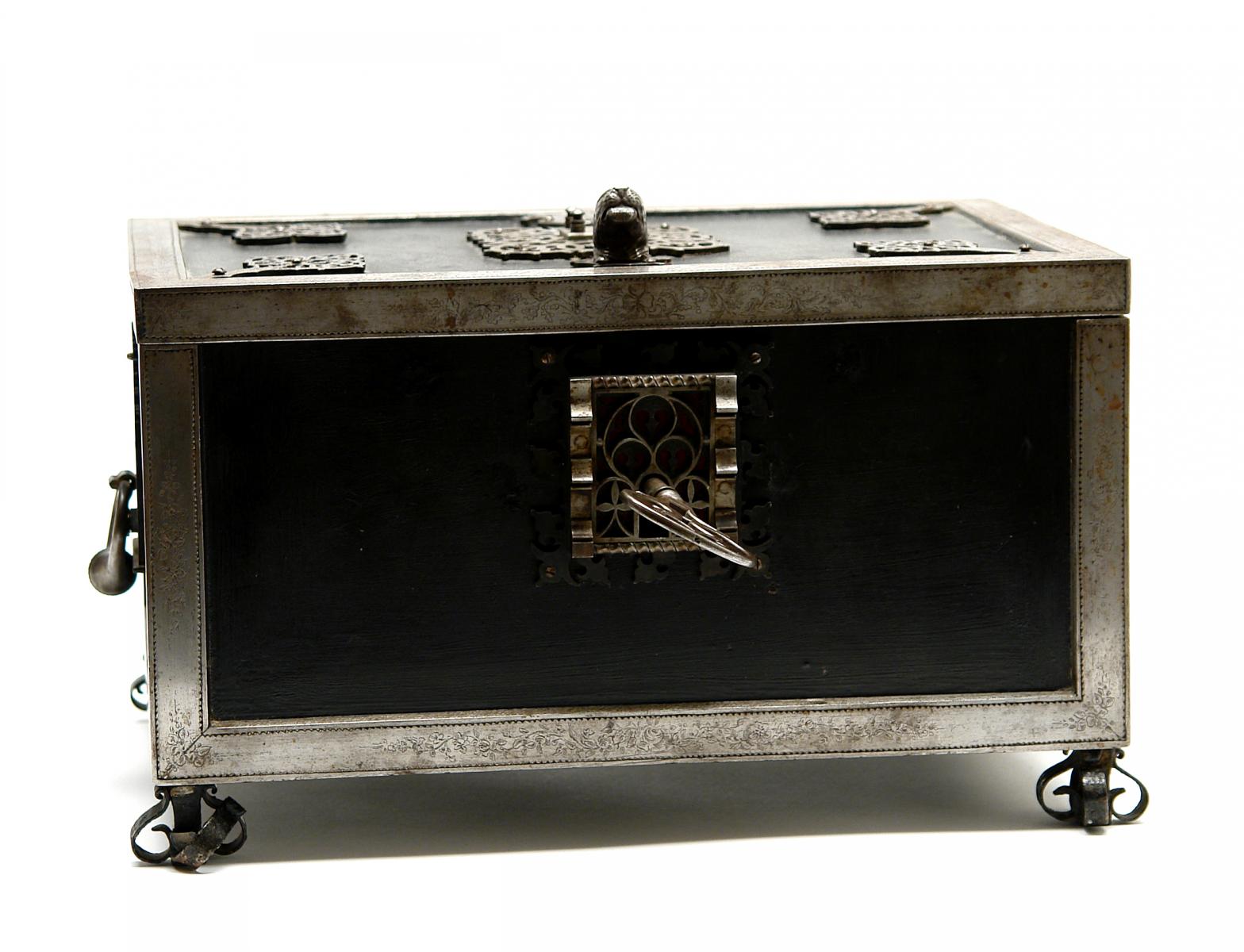 Eisen tlw. graviert. Rechteckige Form mit Klappdeckel. Gotisierende Dekorelemente. Seitliche Griffe. 19x32,5x22cm. Zustand B.