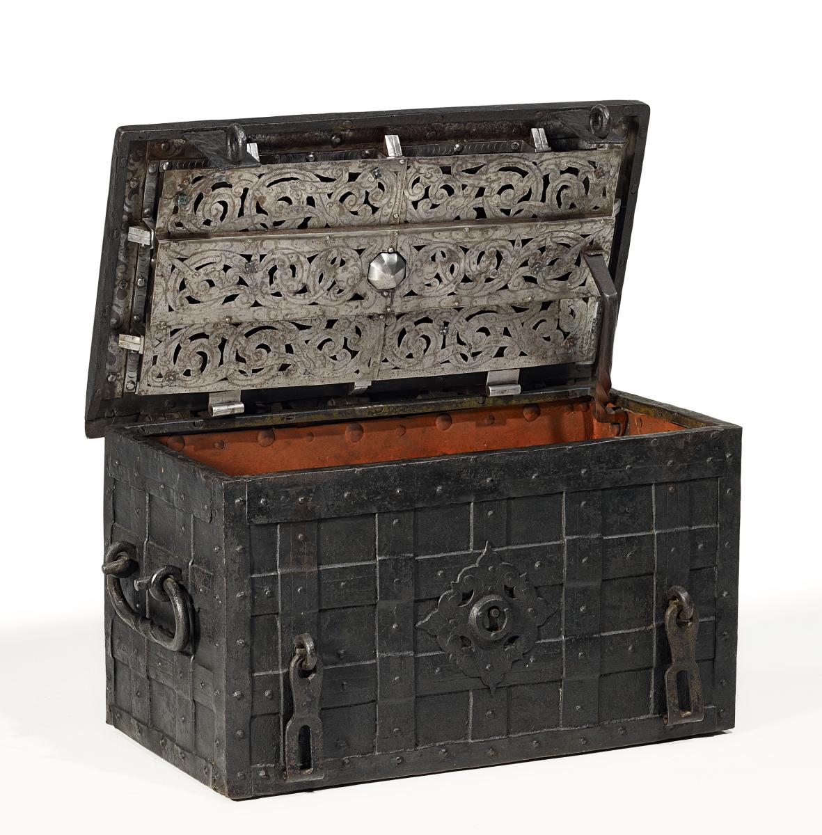 Eisen. Kastenform mit seitlichen Tragegriffen. Umlaufend genietete Bänder. Innen Schloss mit acht