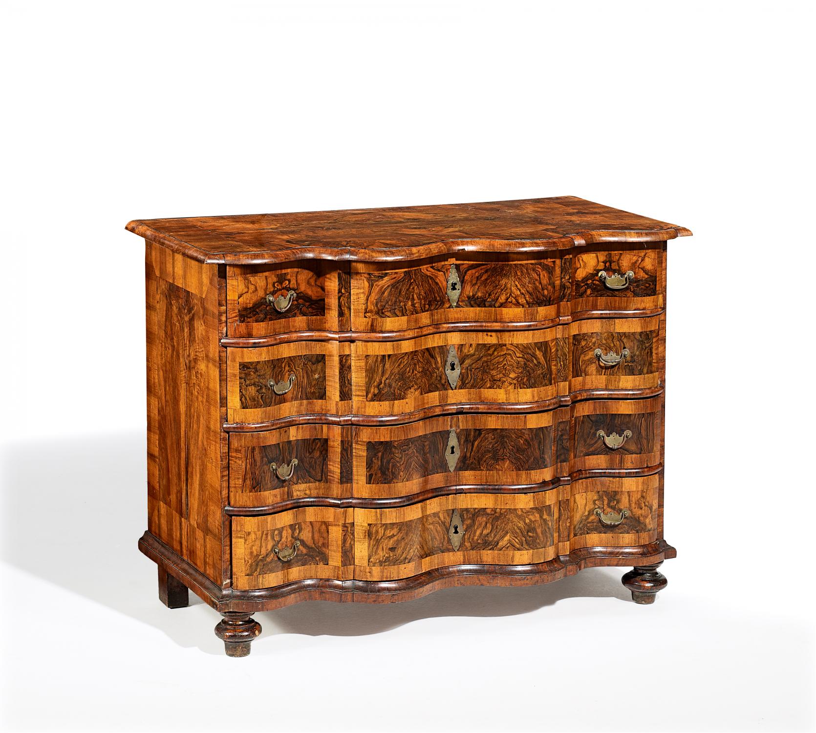 86,5x114x654. Vierschübig gebrochen geschweifter Korpus. Kommode. Zustand B/C.