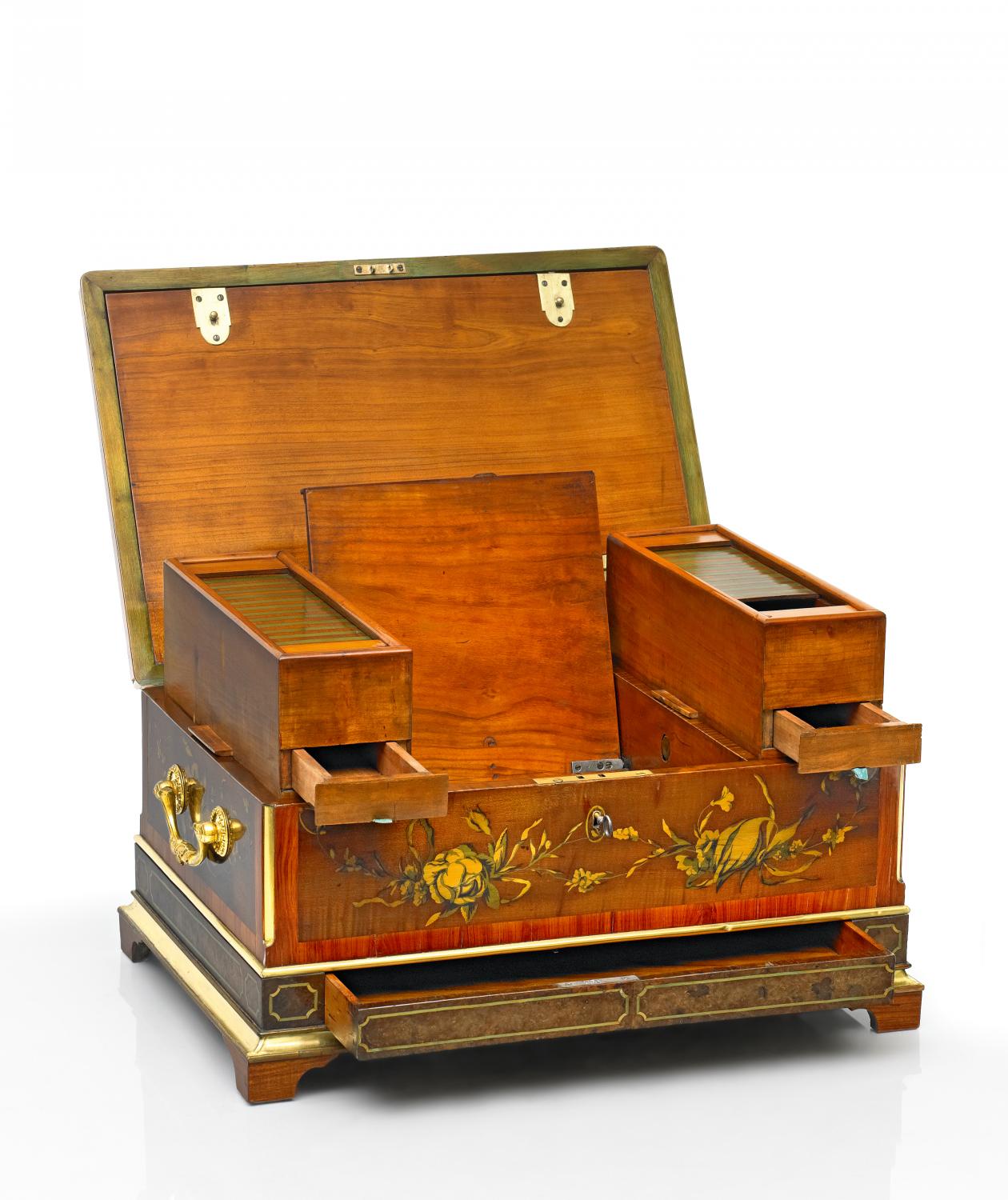 Nicht nur die überragende Qualität der Verarbeitung, die diversen Geheimfächer und -mechanismen, sowie die außergewöhnliche Größe der Schatulle bestechen den Betrachter, sondern vor allem die schon fast wie ein Trompe-l'oeil wirkenden Marketerien. Luftig schweben hier Blumengebinde an Schleifenbändern, die wiederrum an Ösen befestigt sind in der Luft. Diese neue Dekorationsform findet bei David Roentgen erstmals im Jahre 1773 an einem Zylinderbureau für die bayrische Kurfürstin Maria Anna Gebrauch. Bis in die 1780er Jahre erfreut sich diese Dekorationsform äußerster Beliebtheit. Die Darstellung auf Kästchen ist allerdings sehr selten und findet sich meist eher auf größeren Möbeln. Nur wenige weitere Schatullen mit vergleichbarer Marketerie sind der Fachwelt bislang bekannt.