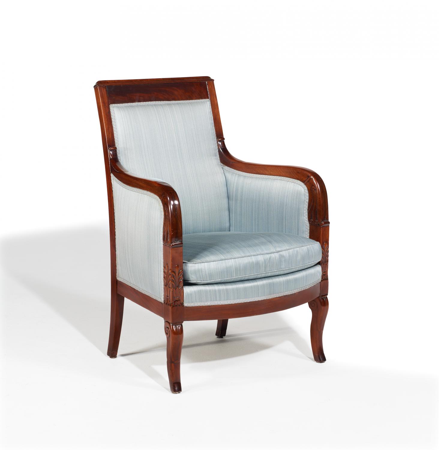 Höhe 91. Abgerundete Armlehnen mit floralem Schnitzdekor. Bergere. Zustand B.