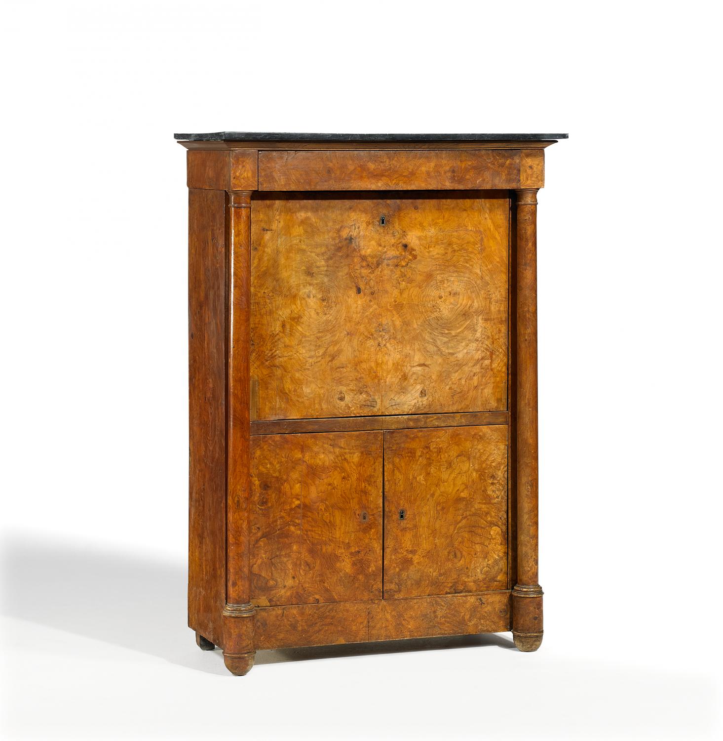 145,5x99x50. Über zwei Türen klappbare Schreibplatte flankiert von zwei Säulen. Innenausbau mit sieben