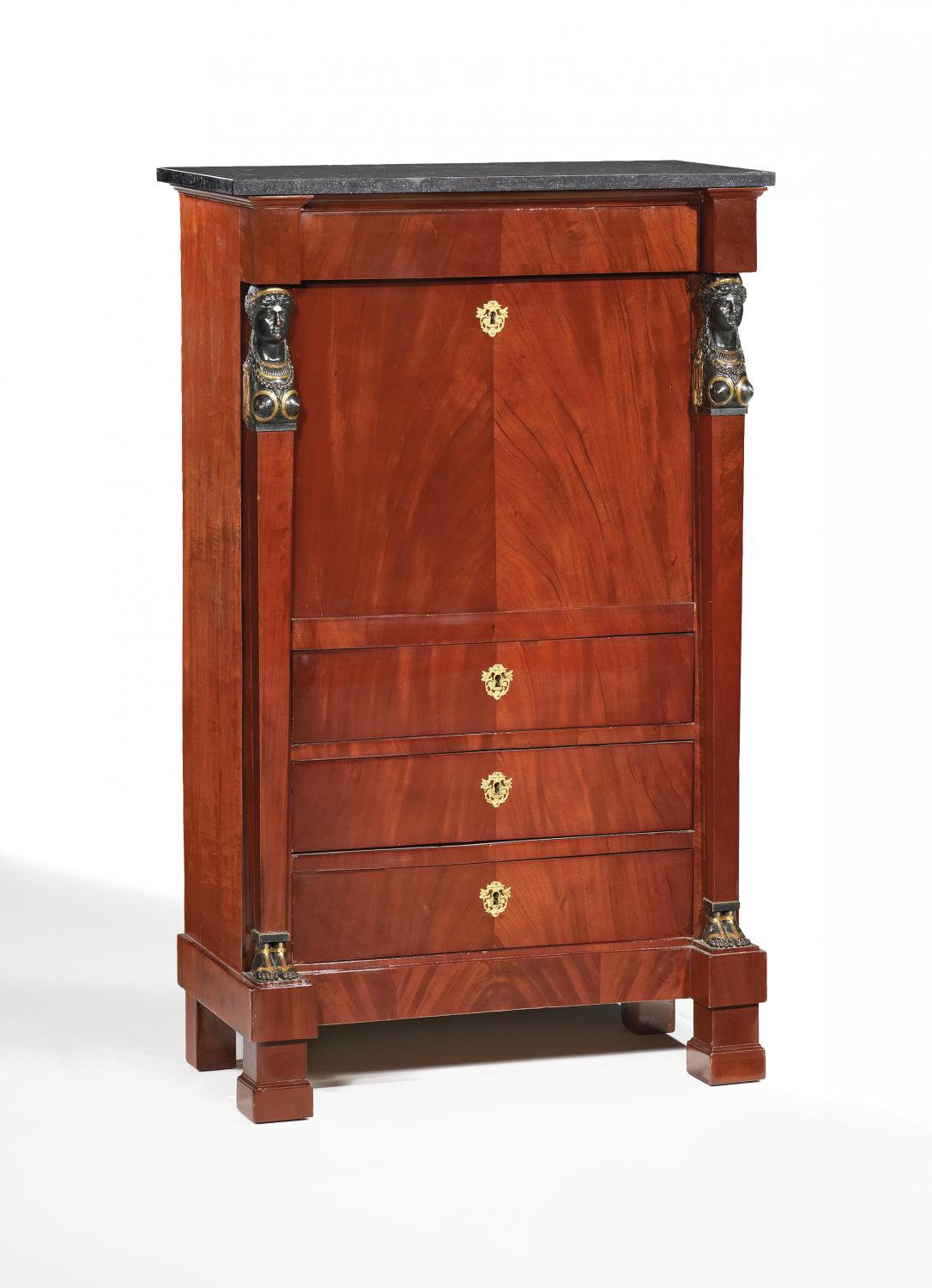 Pilastern mit eingelassenen Karyatiden. Innenausbau mit sieben Schüben. Schreibschrank. Zustand B.