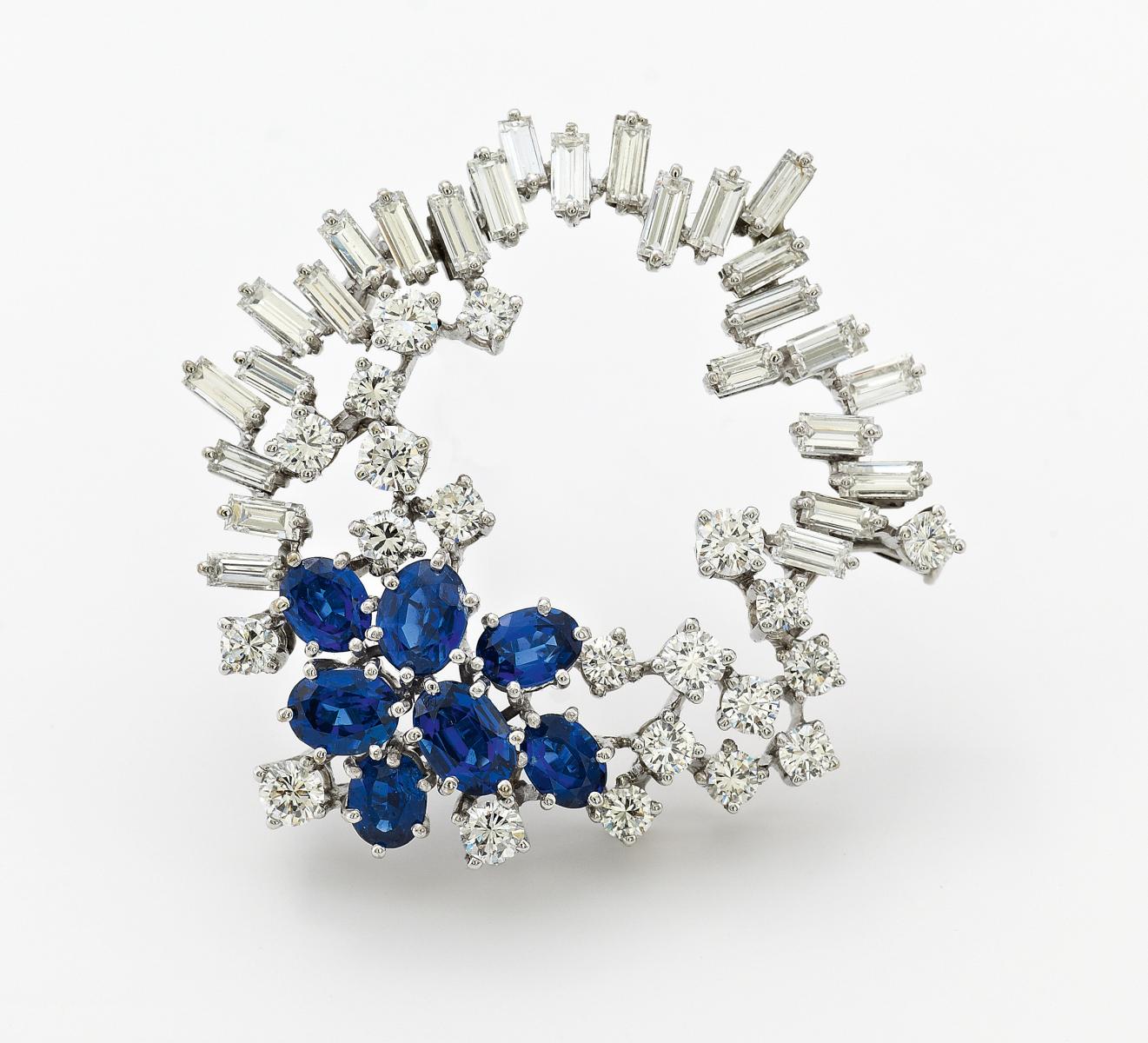Kranzbrosche mit Diamant-Brillant-Saphirbesatz. 750/- WEIßGOLD.