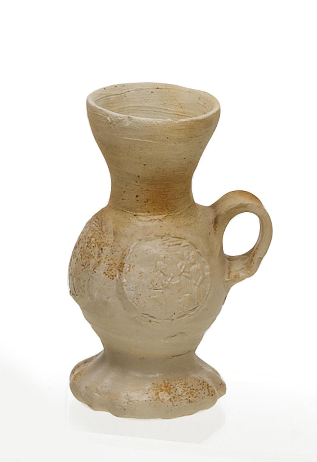 KLEINER TRICHTERHALSKRUG MIT RELIEFAUFLAGEN.